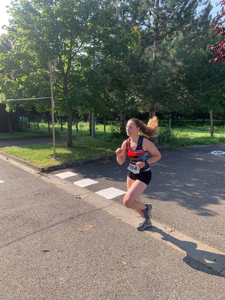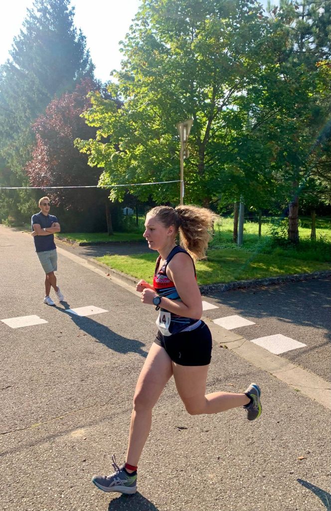Sur la ligne de départ, nous sommes une trentaine. Le départ est très rapide, sûrement un peu trop, mais le niveau est haut sur cette course. Rapidement, des écarts se creusent. Les deux premiers km se passent bien, puis j’accuse le coup du départ un peu trop rapide et je dois ralentir l’allure. Je connais le parcours et je ne me fais pas avoir par la petite boucle à la fin juste avant l’arrivée. J’en profite pour accélérer et terminer au bout de ce que j’ai pu donner. Je suis contente de ma course, je termine ce 5km en 25min36secondes mon meilleur temps en course ! C’était un plaisir de courir dans le village où j’ai grandi et sous les encouragements des nombreux jeunes et bénévoles de l’Iron !