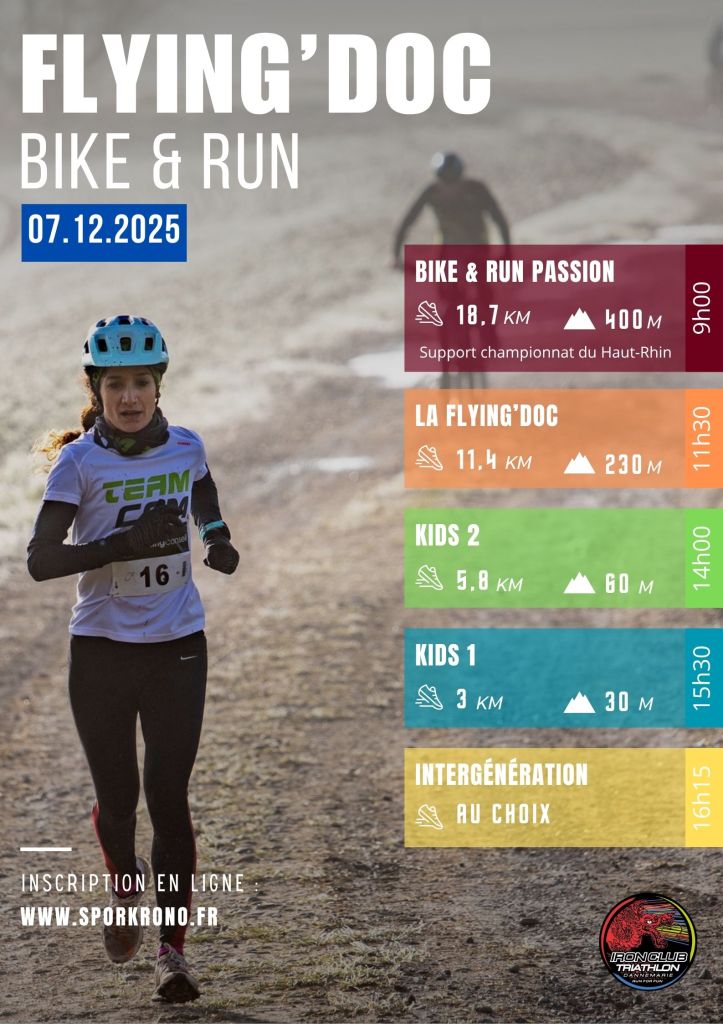 Le Flying’Doc Bike & Run c’est une course en la mémoire de notre doc. Une course accessible à tous et pour tous ! Le bike & run c’est une course par équipe de 2 athlètes alternant course à pied et VTT. Cette année le format S est support des championnats du Haut-Rhin !